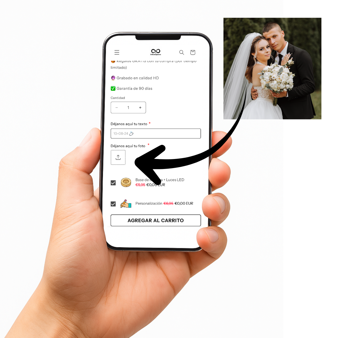 Añade fácilmente tu imagen haciendo clic en el botón resaltado. Solo tienes que subir tu foto o diseño, y nosotros nos encargaremos del resto: crearemos una esfera personalizada única para ti. ¡Rápido y sencillo!