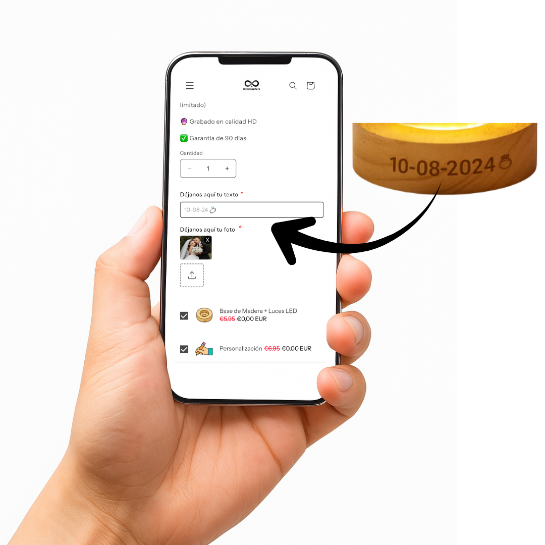 Puedes añadir la fecha de tu enlace, un nombre o una frase, nosotros la tomaremos y grabaremos en la base de madera de tu lámpara. Así darás aún más vida a ese recuerdo tan especial